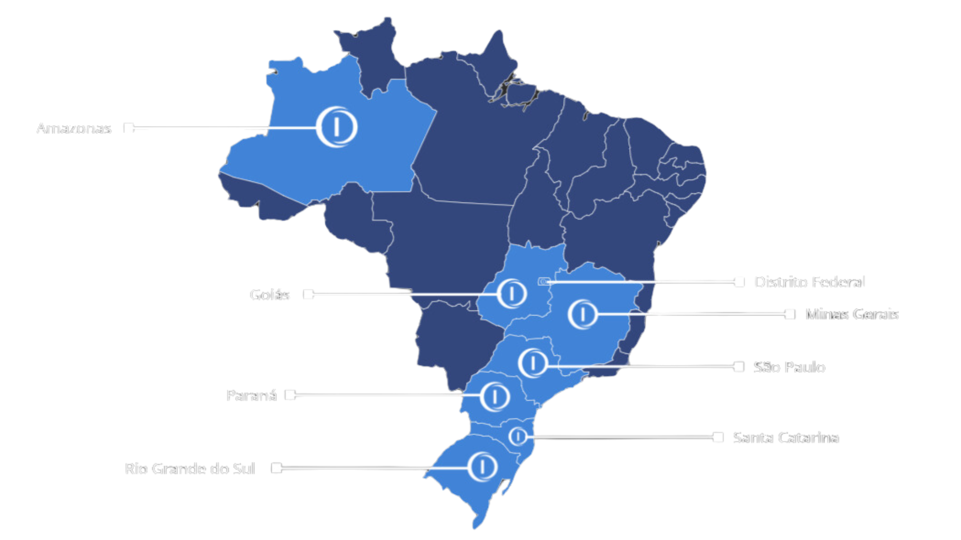 Amazonas, Goiás, Distrito Federal, Minas Gerais, São Paulo, Paraná, Santa Catarina e Rio Grande do Sul.